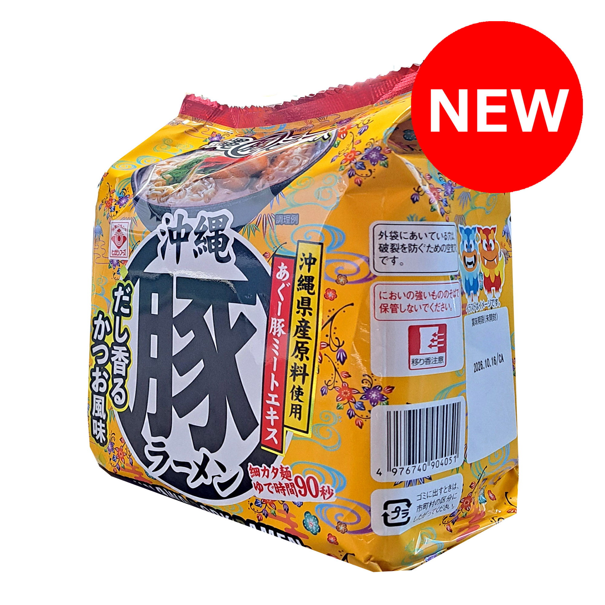 | 原材料名 | 油揚げめん(小麦粉(国内製造)、植物油脂、食塩、ポークエキス(沖縄県産))、粉末スープ(食塩、砂糖、かつお節粉末、粉末しょうゆ、ポークエキス、たん白加水分解物、オニオンパウダー、ガーリックパウダー、胡椒)/加工デンプン、調味料(アミノ酸等)、炭酸Ca、かんすい、増粘多糖類、リン酸塩(Na)、微粒二酸化ケイ素、酸味料、クチナシ色素、香料、酸化防止剤(ビタミンE)、(一部に小麦・大豆・豚肉・ごまを含む) |